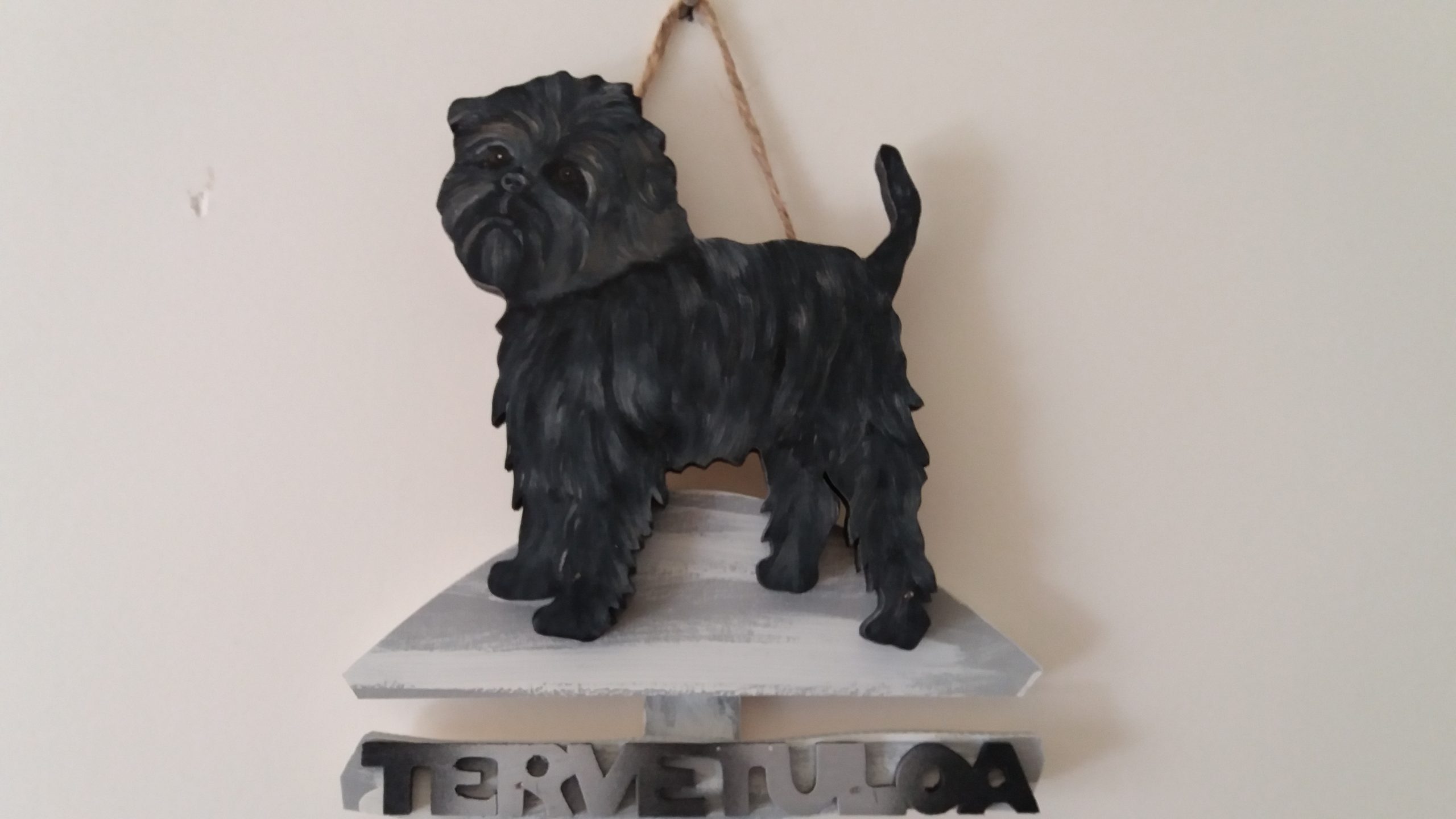 Puinen tervetuloakyltti joka kuvastaa Affenpinseriä. Maalattu sään kestävillä öljyväreillä.