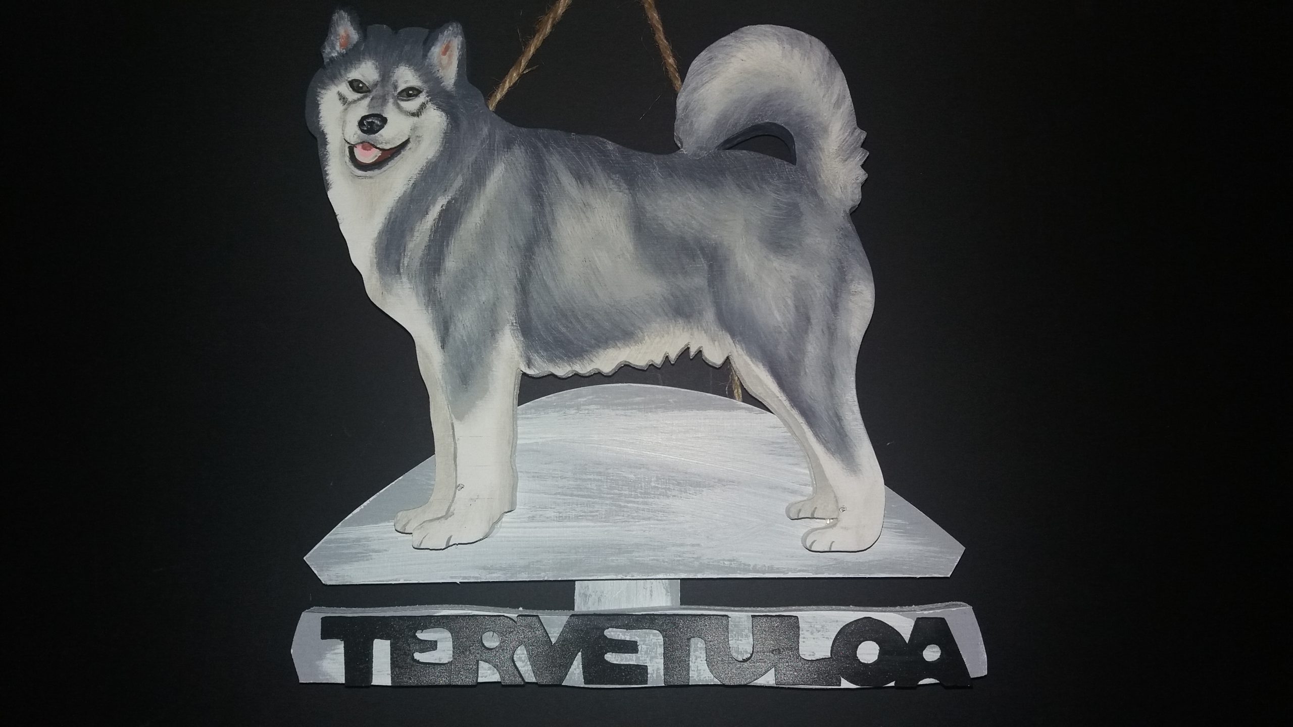 Puinen tervetuloakyltti joka kuvastaa Alaskanmalamuttia. Maalattu sään kestävillä öljyväreillä.