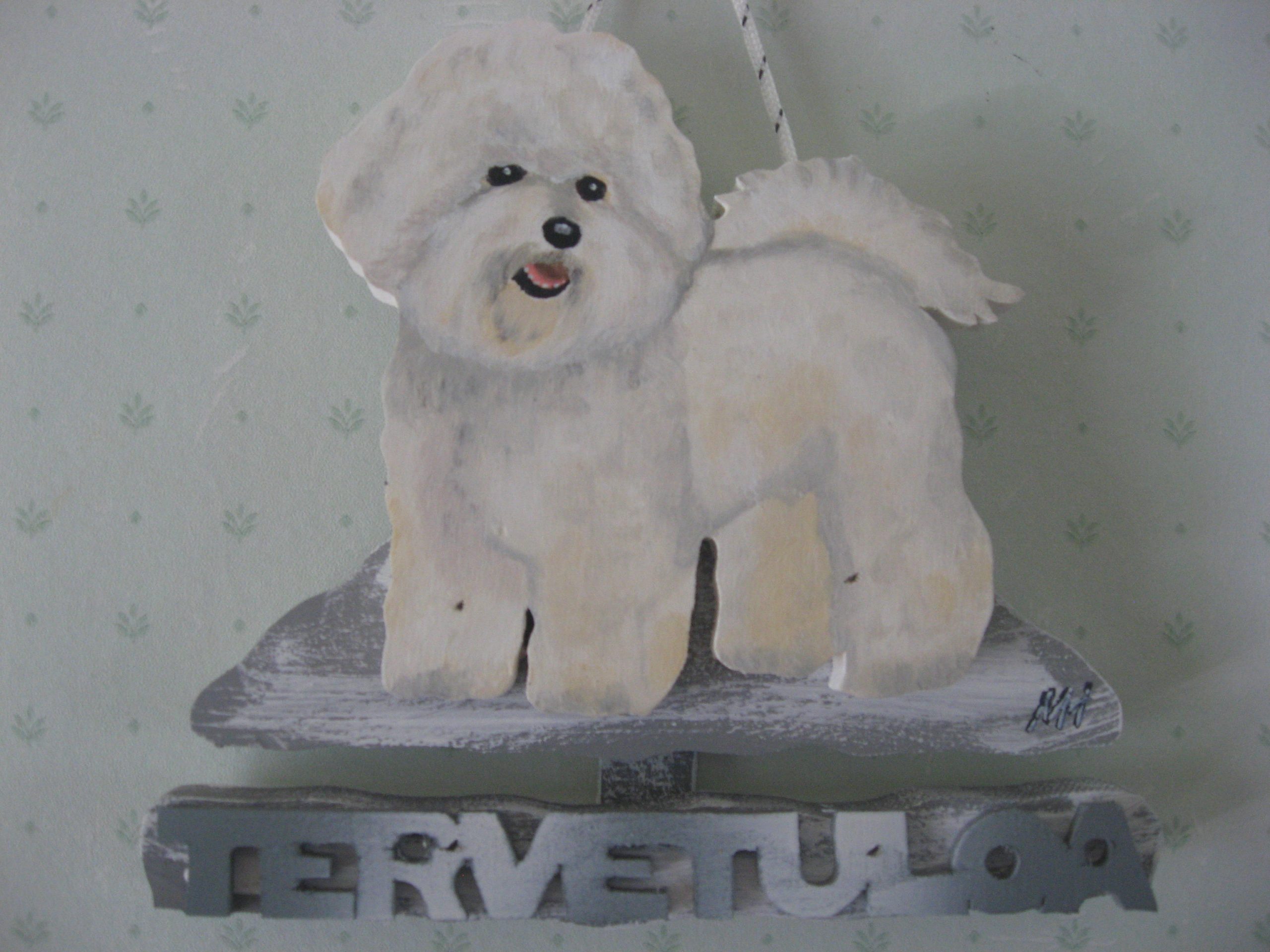 Puinen tervetuloakyltti joka kuvastaa Bishon friseä. Maalattu sään kestävillä öljyväreillä.