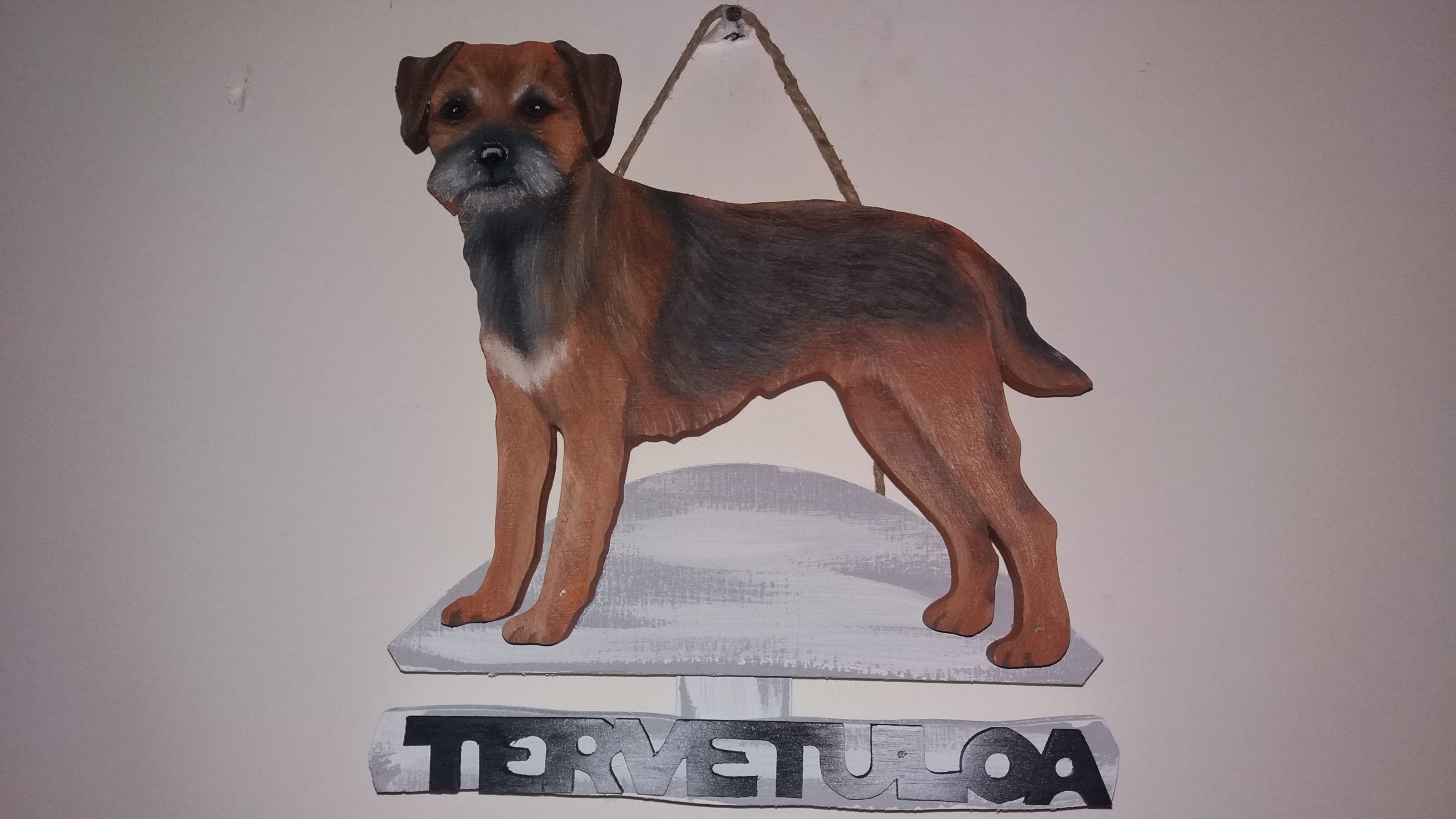 Puinen tervetuloakyltti joka kuvastaa Borderterrieriä. Maalattu sään kestävillä öljyväreillä.
