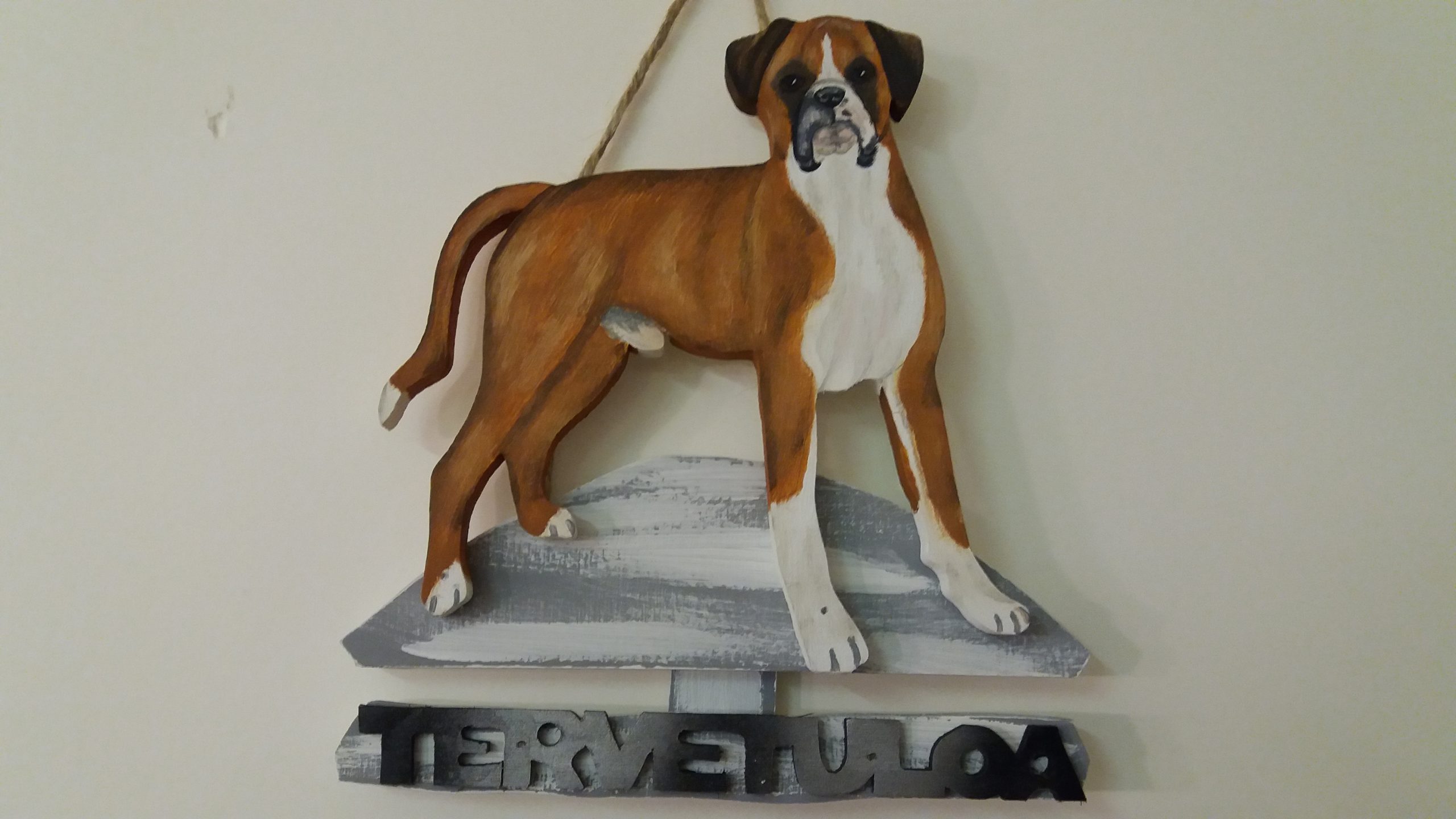 Puinen tervetuloakyltti joka kuvastaa Boxeria. Maalattu sään kestävillä öljyväreillä.