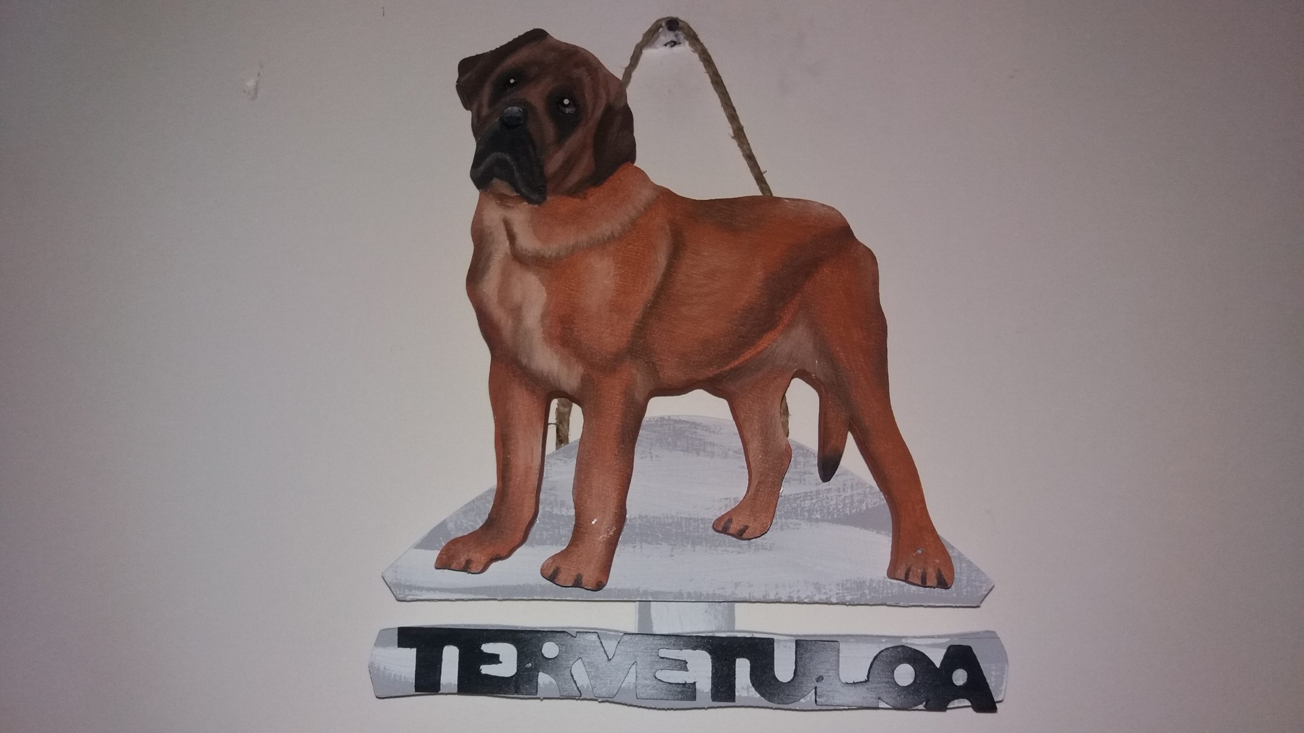 Puinen tervetuloakyltti joka kuvastaa Bullmastiffia. Maalattu sään kestävillä öljyväreillä.