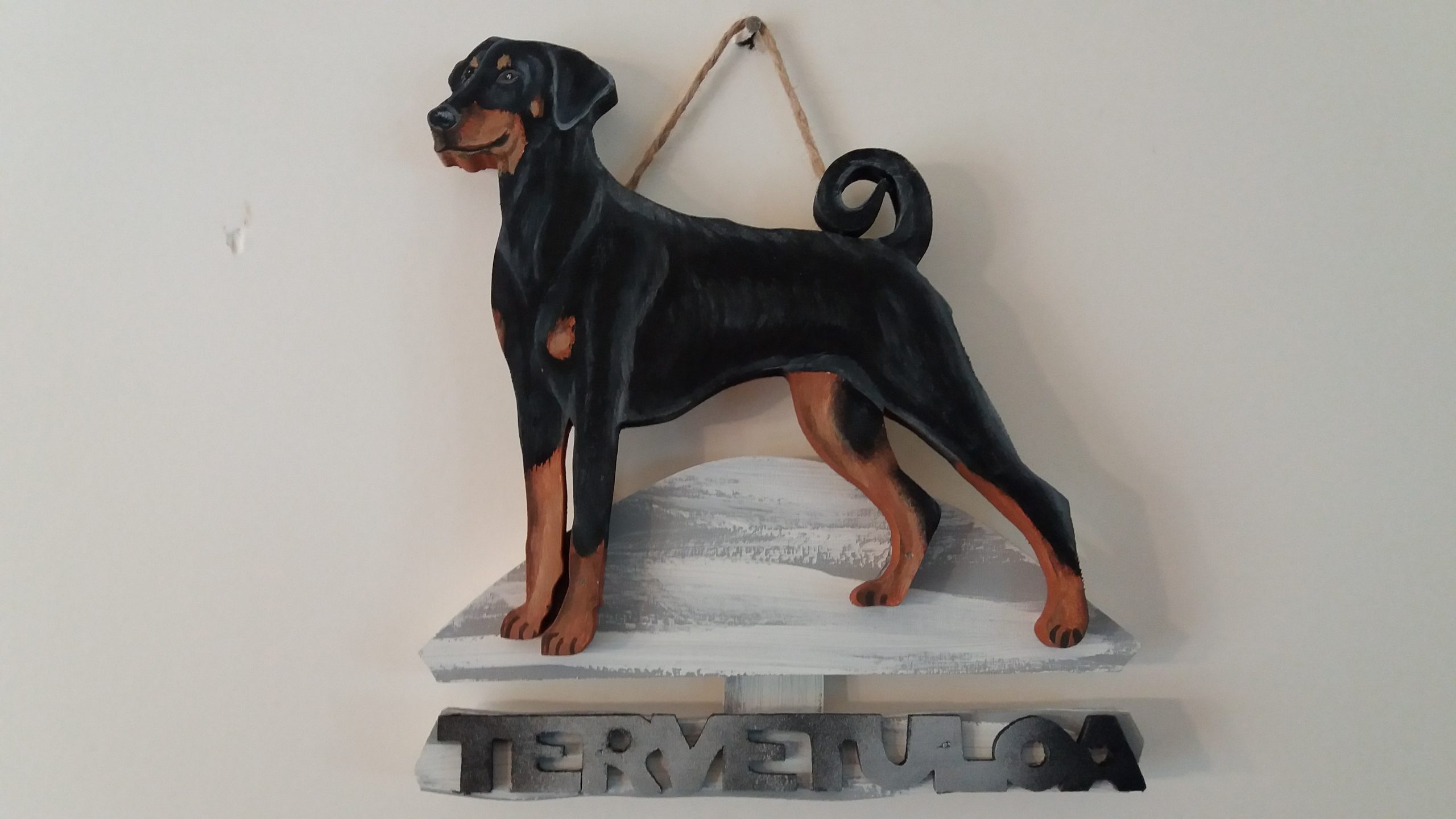 Puinen tervetuloakyltti joka kuvastaa Dobermannia. Maalattu sään kestävillä öljyväreillä.