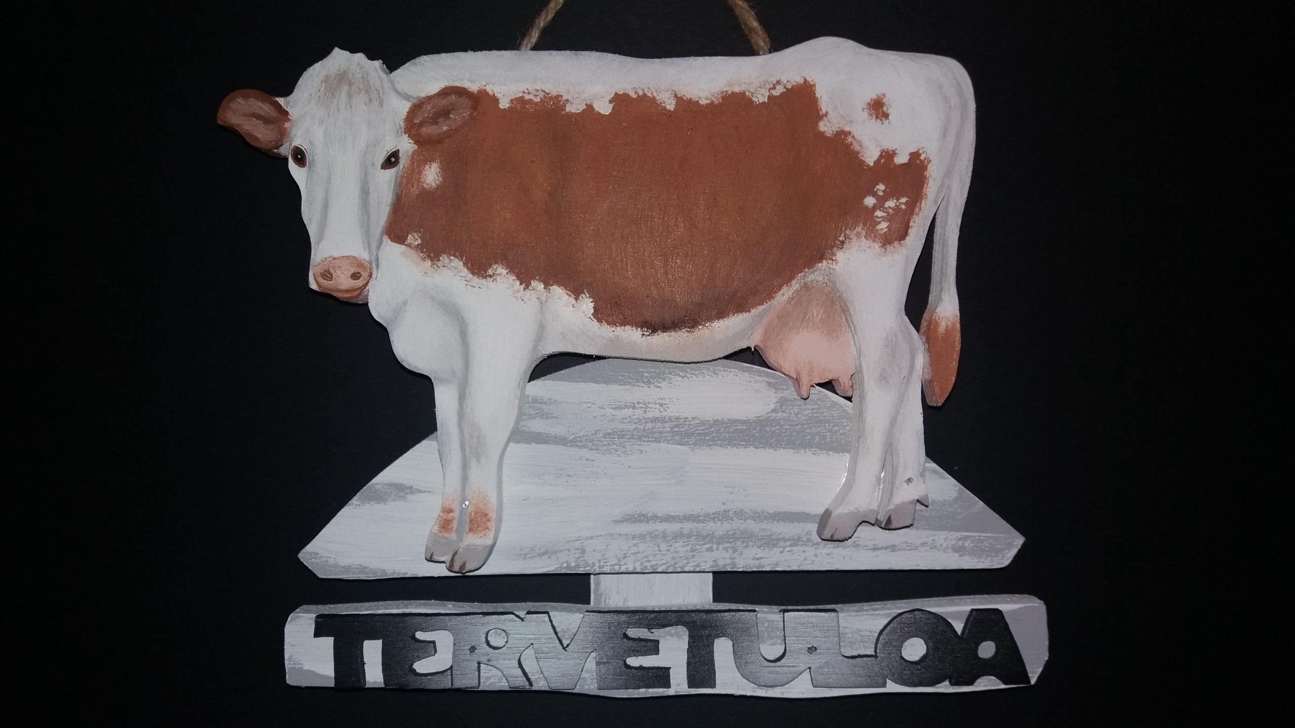 Puinen tervetuloakyltti joka kuvastaa Itäsuomenkarjaa. Maalattu sään kestävillä öljyväreillä.