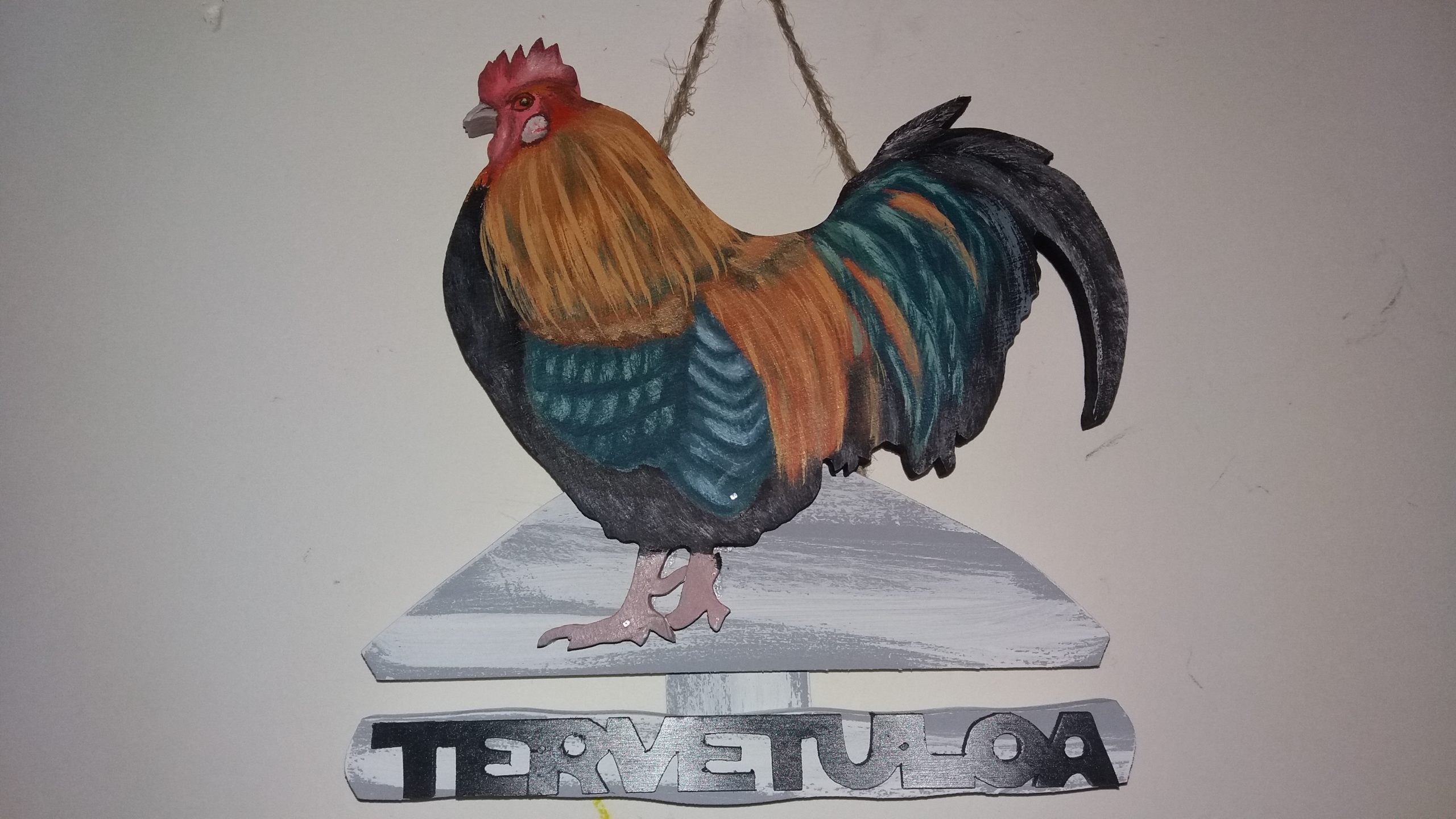 Puinen tervetuloakyltti joka kuvastaa Kirjavakukkoa. Maalattu sään kestävillä öljyväreillä.