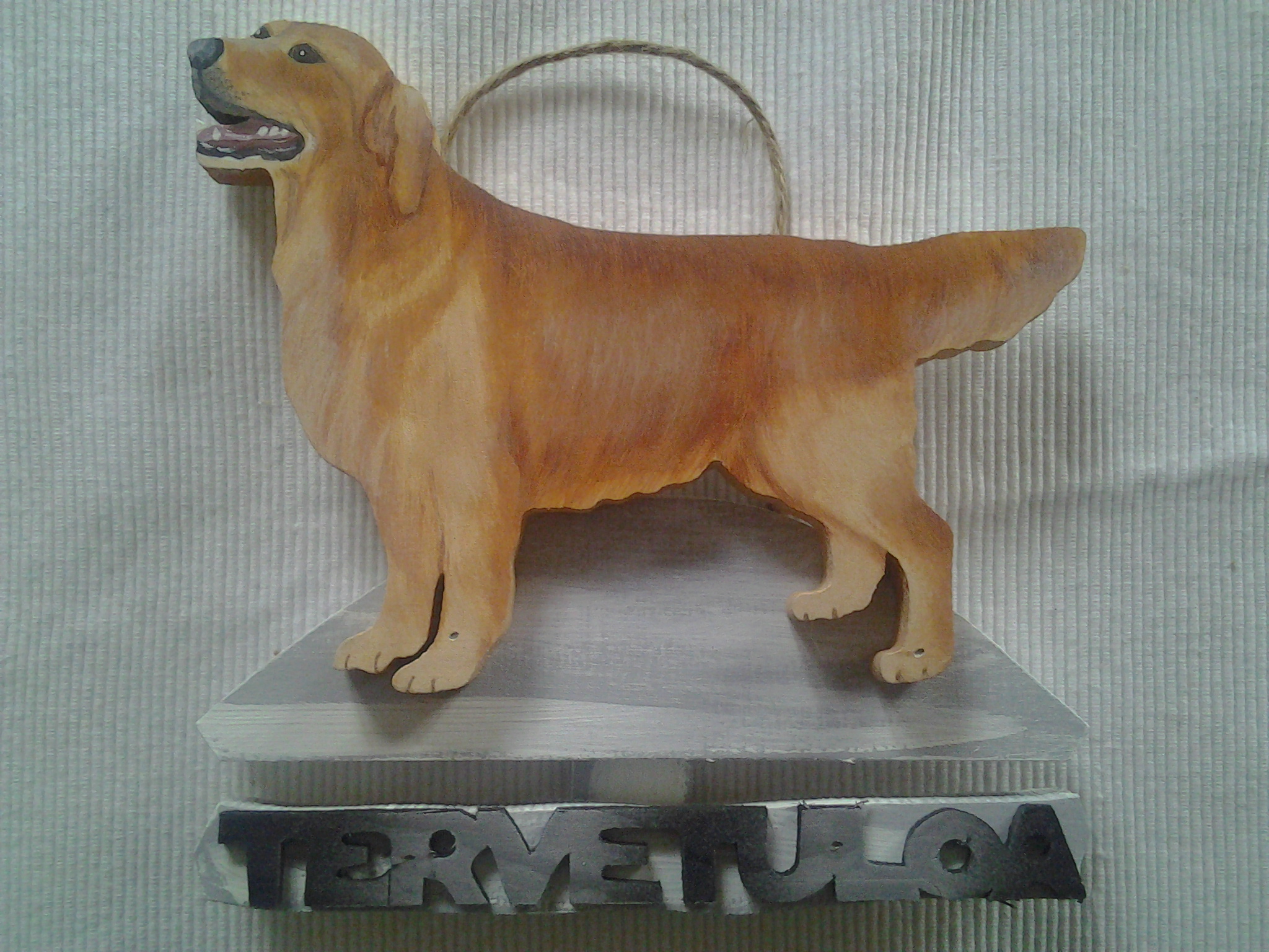 Puinen tervetuloakyltti joka kuvastaa Kultaistanoutajaa. Tämä on vanha malli. Maalattu sään kestävillä öljyväreillä.