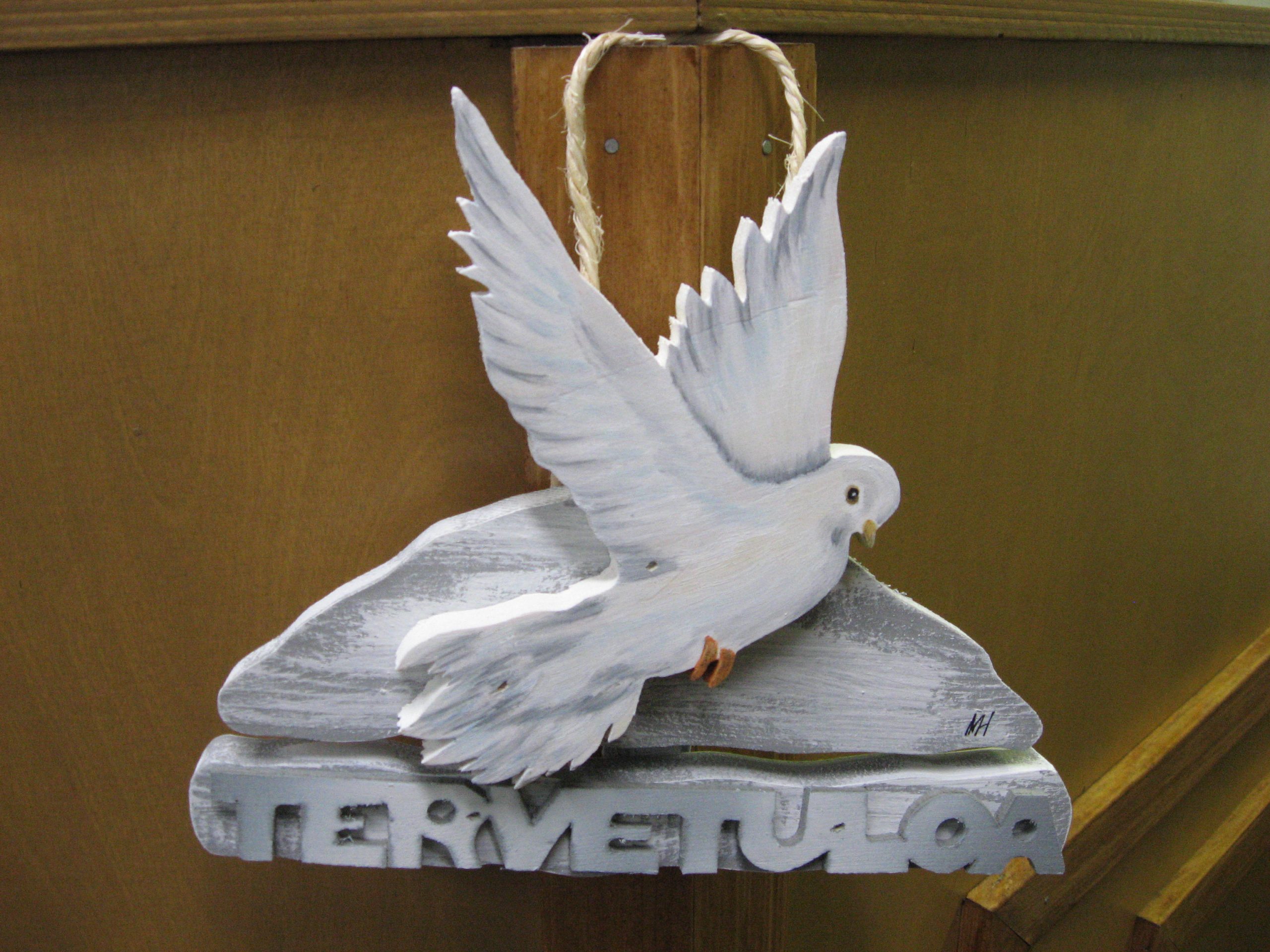 Puinen tervetuloakyltti joka kuvastaa Kyyhkyä. Maalattu sään kestävillä öljyväreillä.