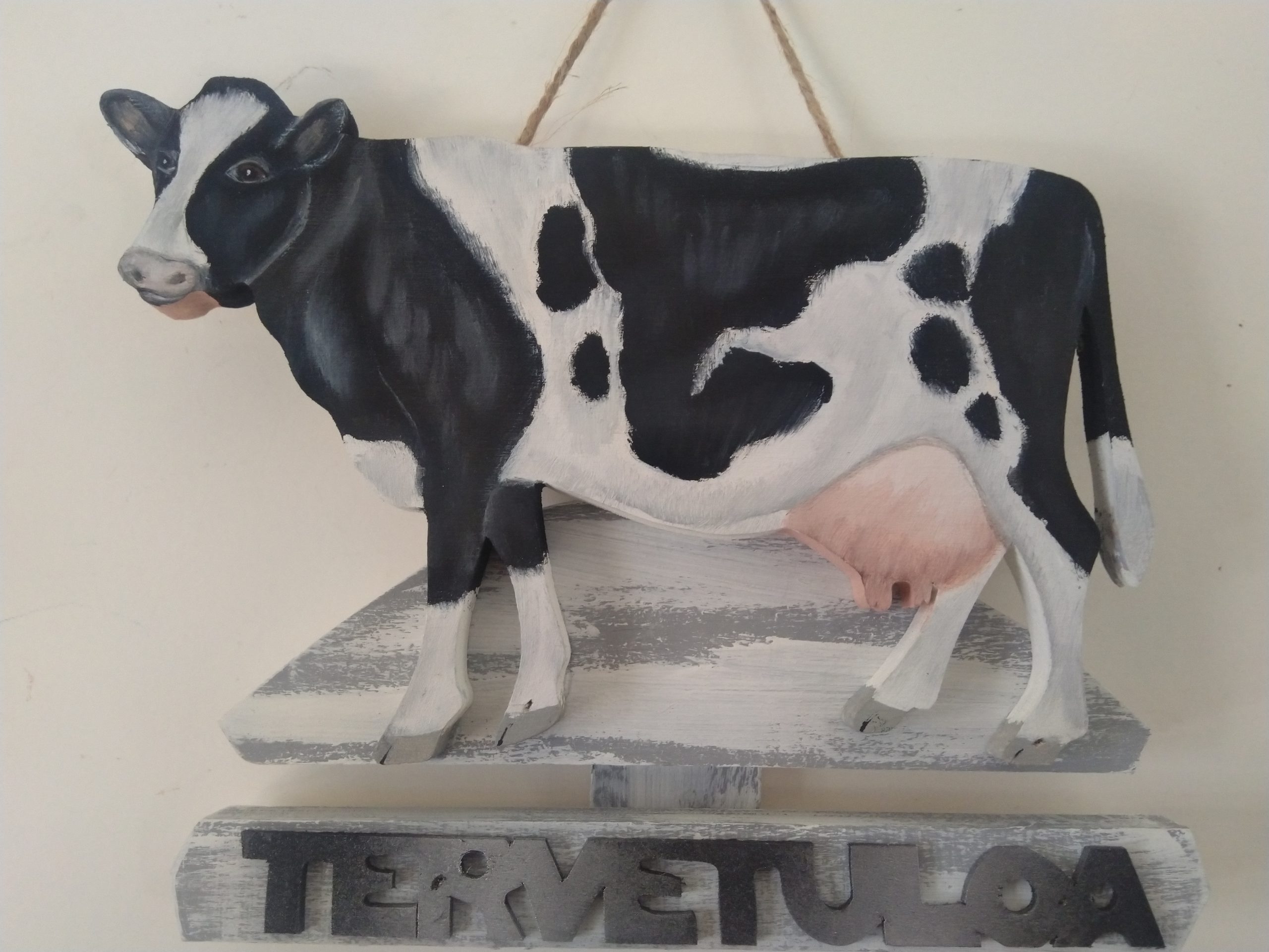 Puinen tervetuloakyltti joka kuvastaa Lehmää. Maalattu sään kestävillä öljyväreillä.