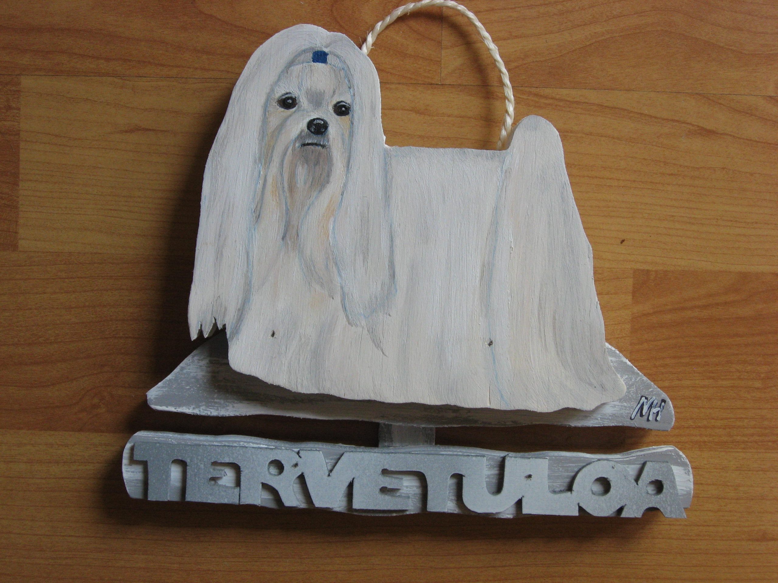 Puinen tervetuloakyltti joka kuvastaa Maltankoiraa. Maalattu sään kestävillä öljyväreillä.