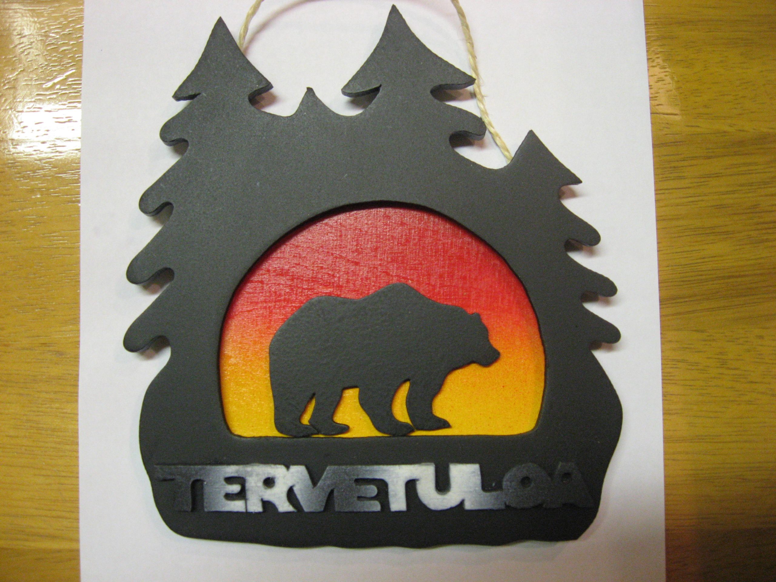 Puinen tervetuloakyltti joka kuvastaa Metsän karhua. Maalattu sään kestävillä öljyväreillä.