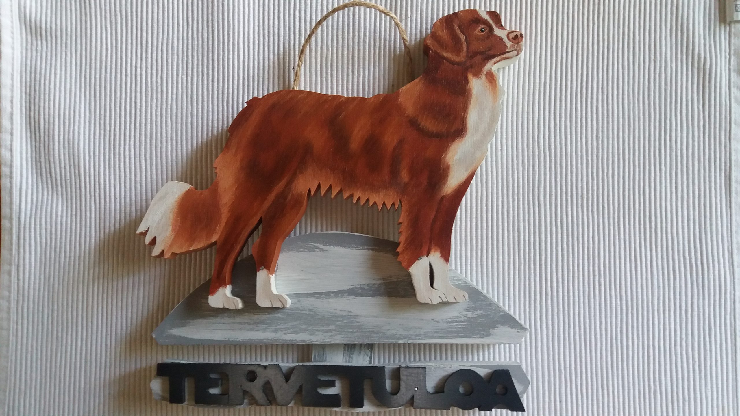 Puinen tervetuloakyltti joka kuvastaa Novascotiannoutajaa. Maalattu sään kestävillä öljyväreillä.