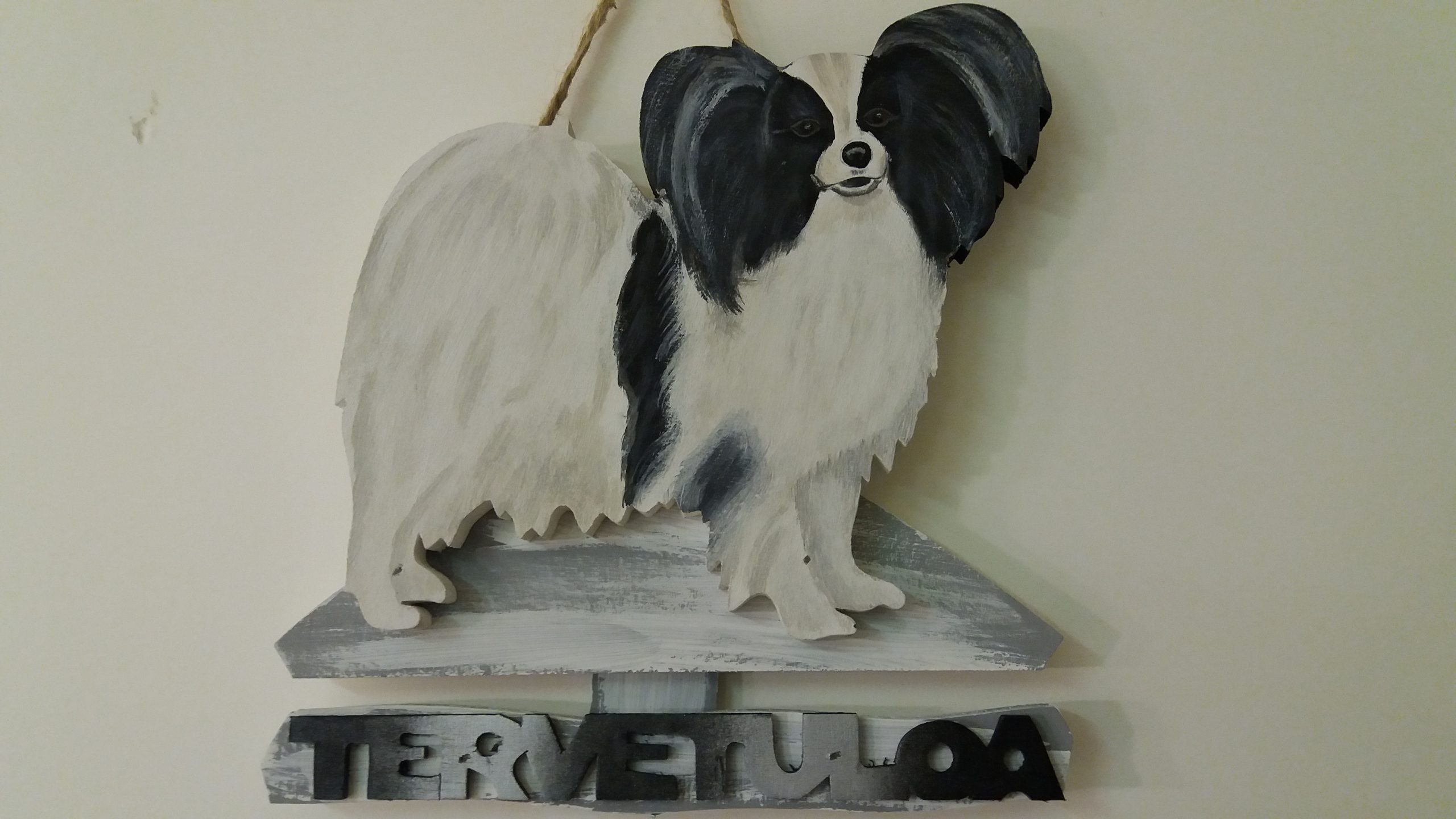 Puinen tervetuloakyltti joka kuvastaa Perhoskoiraa. Maalattu sään kestävillä öljyväreillä.