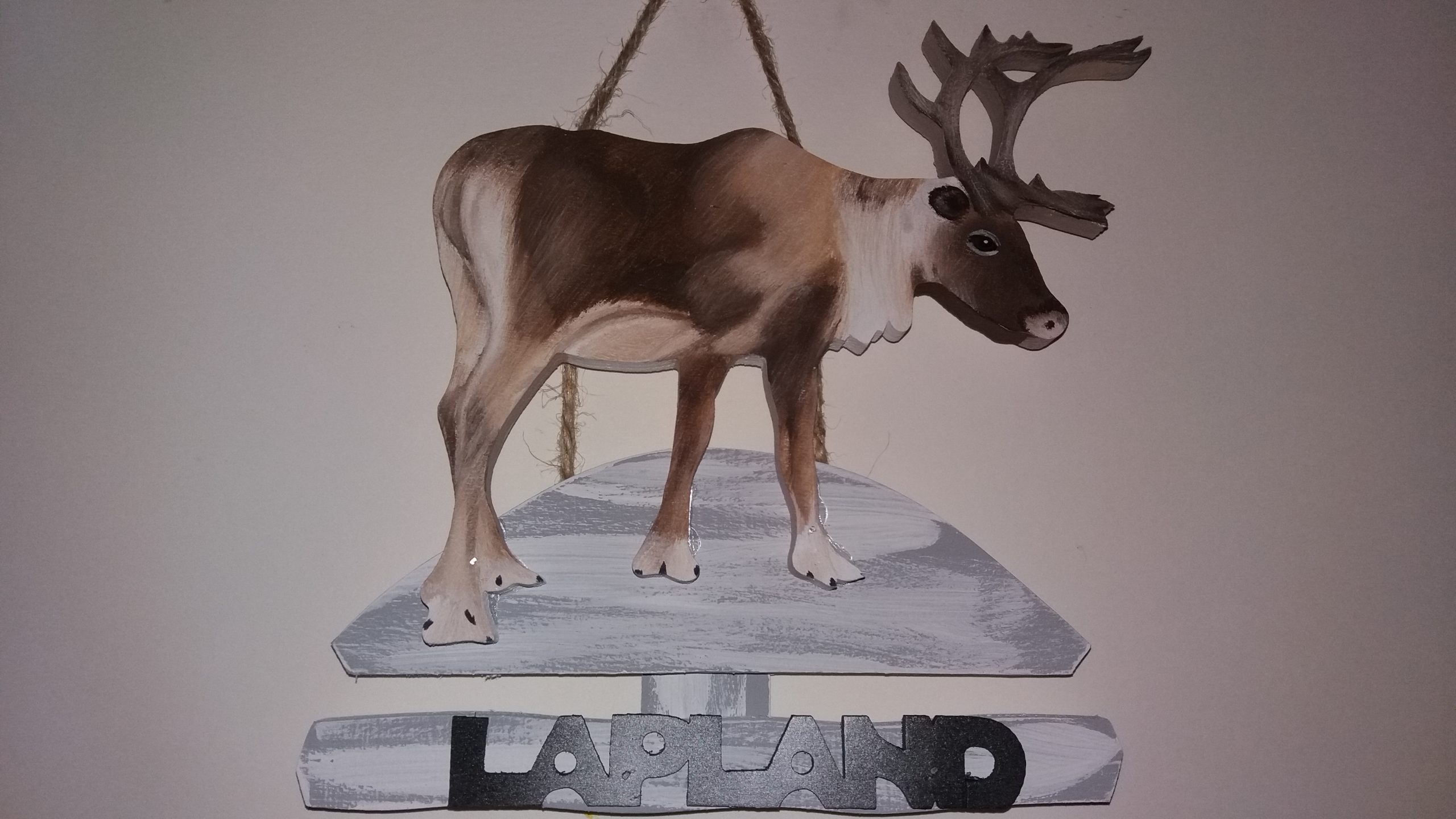 Puinen tervetuloakyltti joka kuvastaa Poroa. Maalattu sään kestävillä öljyväreillä.