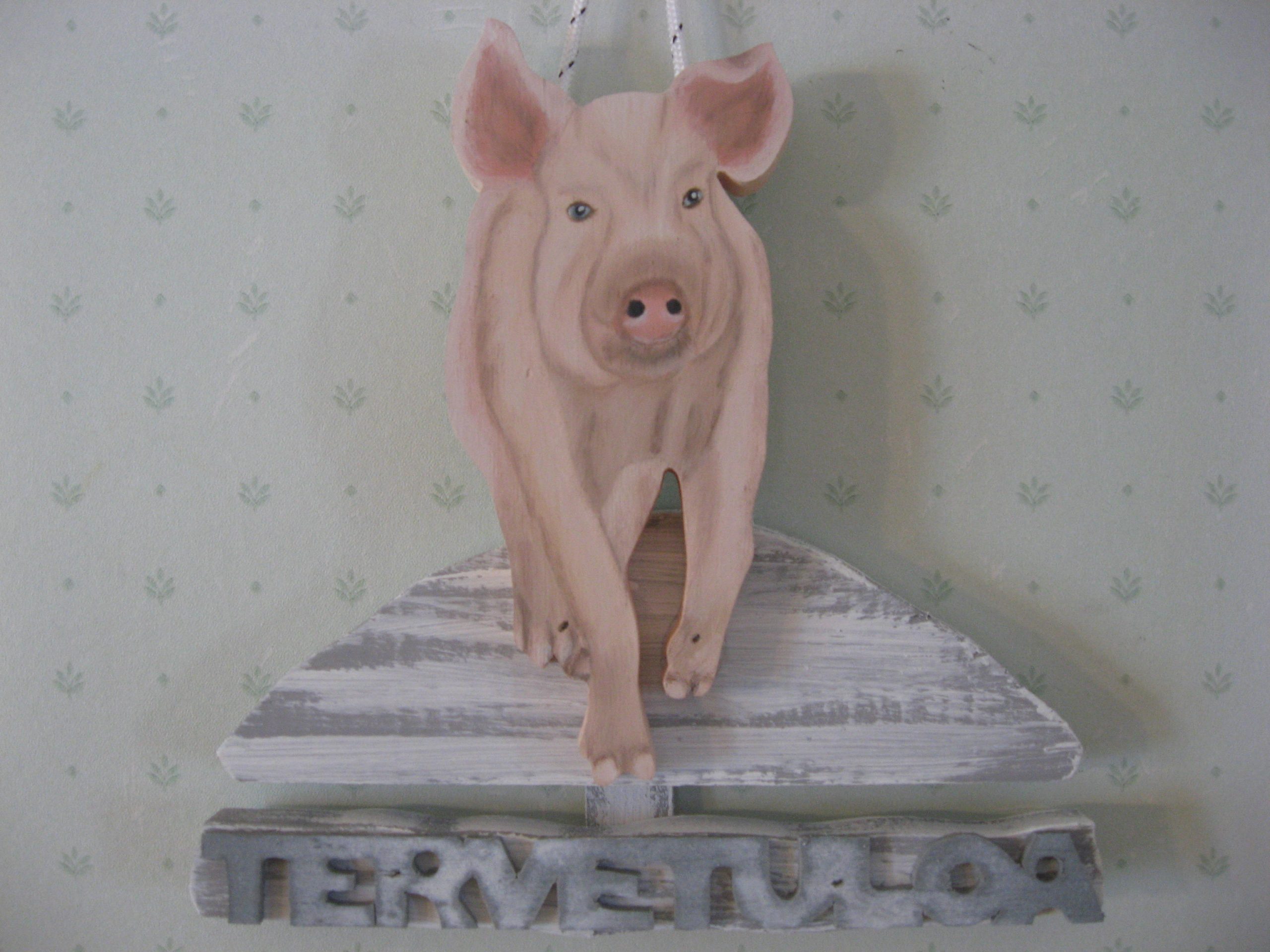 Puinen tervetuloakyltti joka kuvastaa Possua. Maalattu sään kestävillä öljyväreillä.