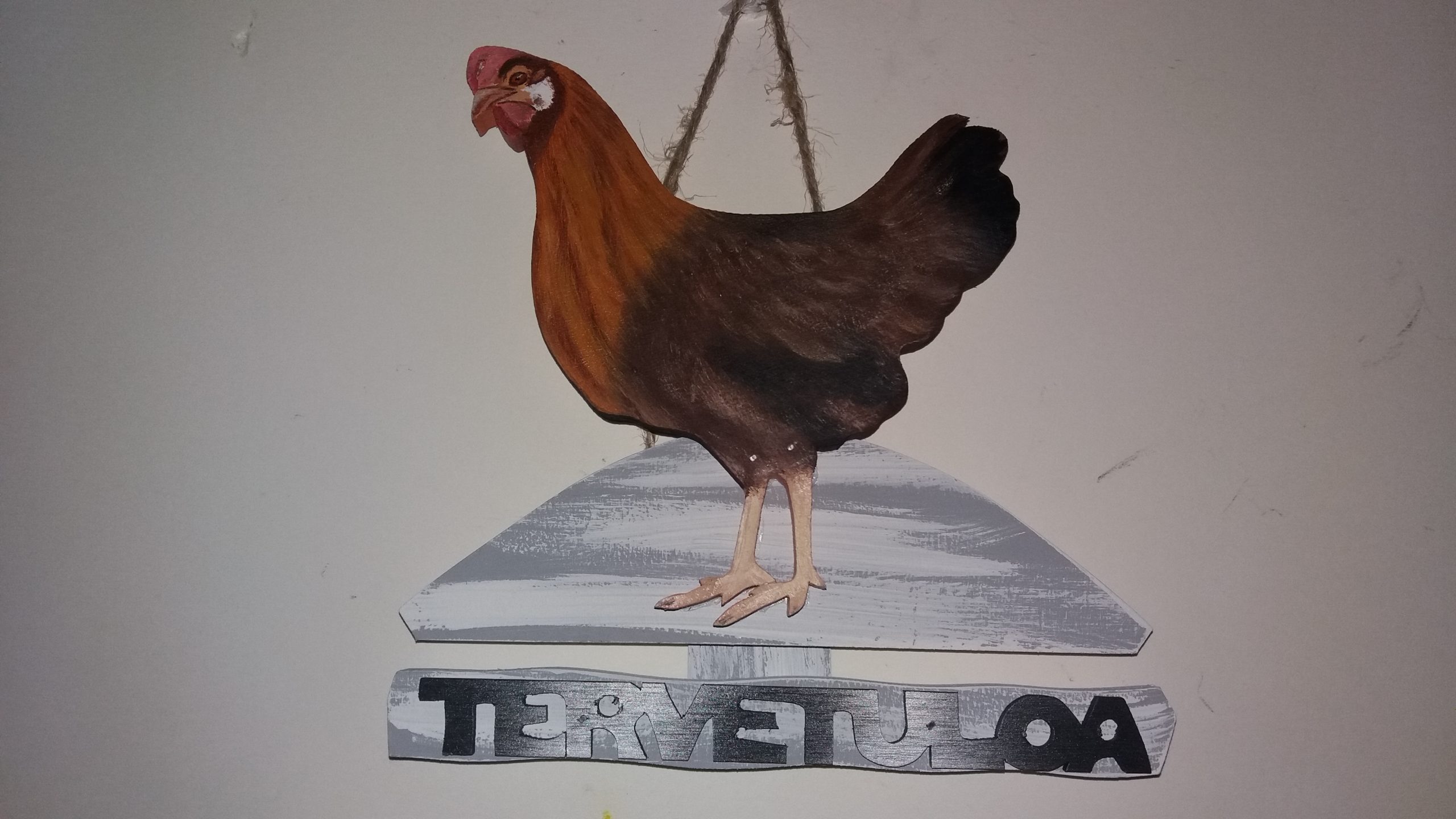 Puinen tervetuloakyltti joka kuvastaa Ruskeakanaa. Maalattu sään kestävillä öljyväreillä.