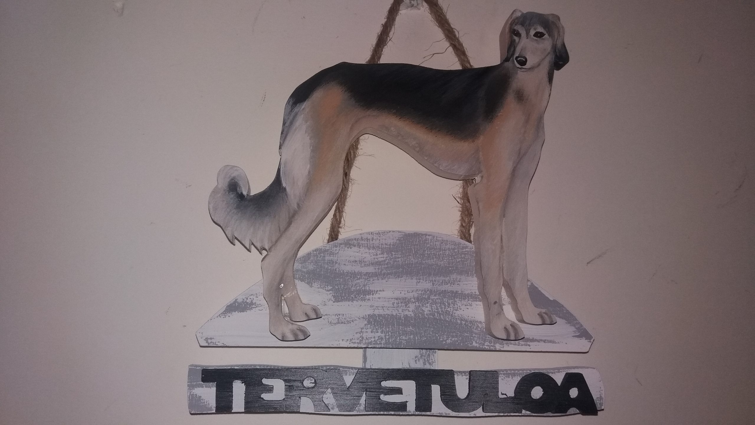 Puinen tervetuloakyltti joka kuvastaa Salukia. Maalattu sään kestävillä öljyväreillä.