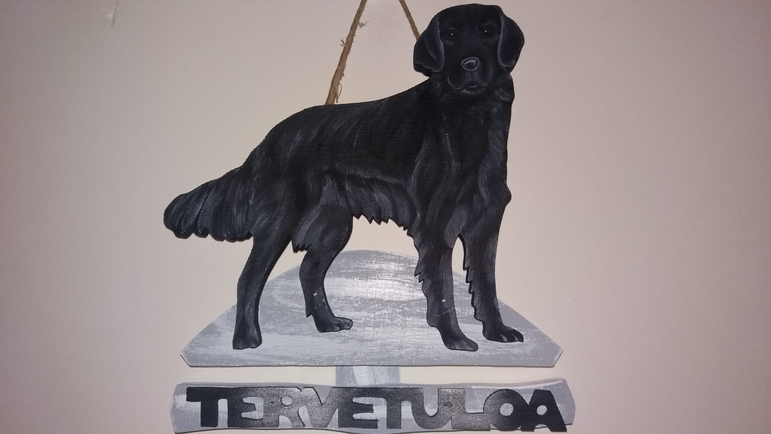 Puinen tervetuloakyltti joka kuvastaa Sileäkarvaista noutajaa. Maalattu sään kestävillä öljyväreillä.