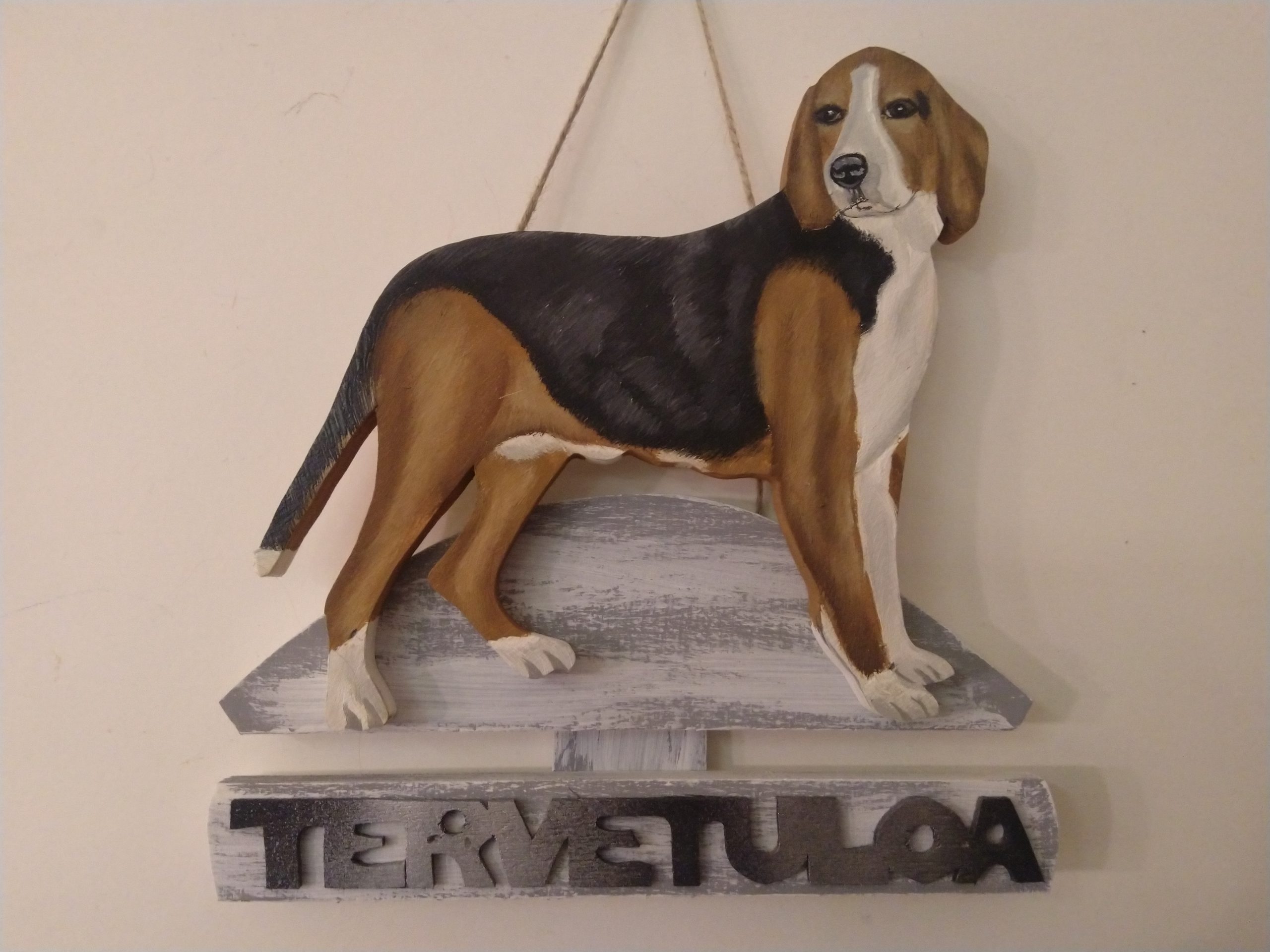 Puinen tervetuloakyltti joka kuvastaa Suomenajokoiraa. Maalattu sään kestävillä öljyväreillä.