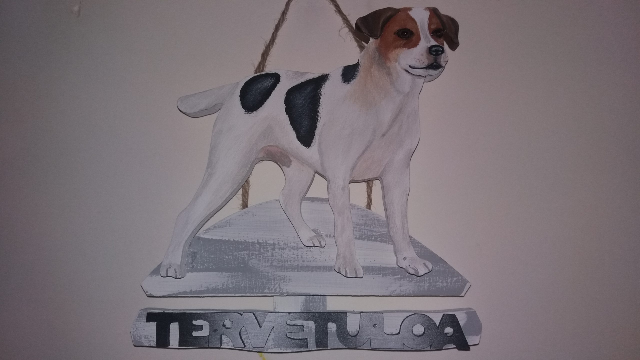 Puinen tervetuloakyltti joka kuvastaa Tanskalais-ruotsalaista pihakoiraa. Maalattu sään kestävillä öljyväreillä.